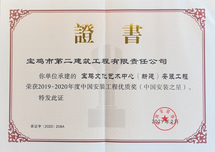 2019~2020年度中國安裝工程優(yōu)質獎(寶雞文化藝術中心(新建)安裝工程)